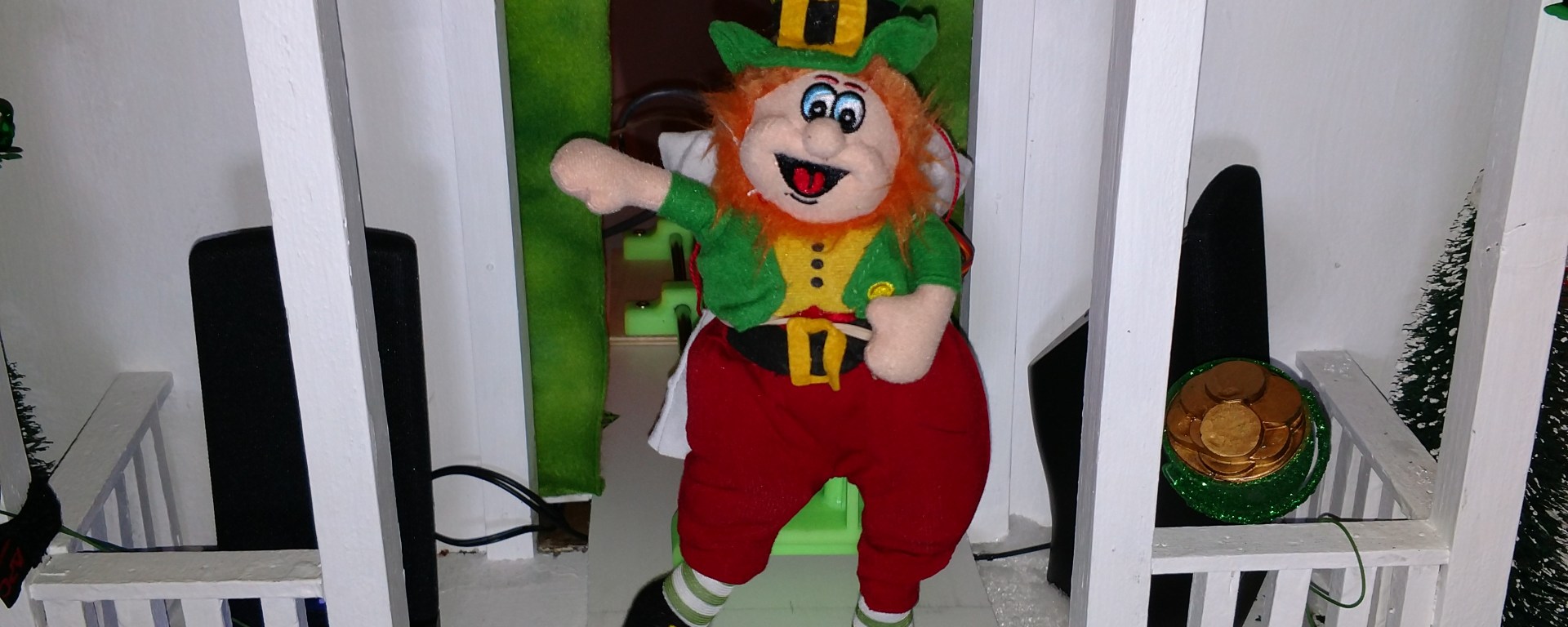 This leprechaun stays hidden until the motion detecting sensor notes an object in front of the dollhouse. The Arduino then calls the stepper motor to cause the articulating arm to push the leprechaun out the front door. Four servos then make the leprechaun dance the Swallowtail Jig. It’s a nice St. Patrick’s Day greeting to all who come to our home!