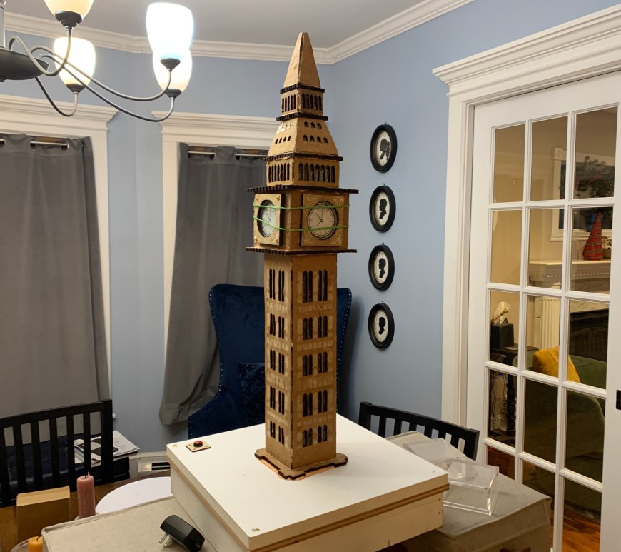 Elizabeth Tower/ Big Ben is crafted with gingerbread in 2025 inspired by Josie’s trip to London. The construction gingerbread is baked and the pieces are cut using the CO2 laser after modifying on a 3D plan of Big Ben we found online. The edges were routered to make for a snug fit. Isomalt was used for the windows. The lights and bells were activated by … Continue reading Big Ben Gingerbread