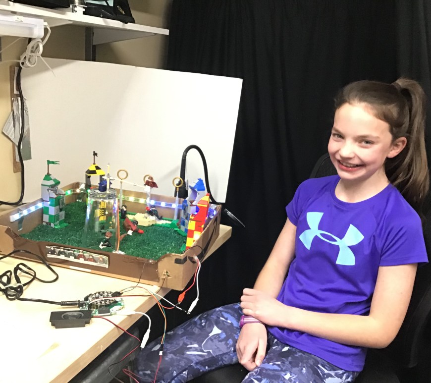 Jo highVoltage brought her lego scene to life using her CPX, a Crickit, a continuous servo, a NeoPixel strip and an external speaker. This project is coded in CircuitPython. The video shows how the project was made. Here is the CircuitPython code for this project: import time import board import digitalio from adafruit_crickit import crickit import neopixel import audioio num_pixels = 30 # … Continue reading Jo highVoltage Harry Potter Lego Quidditch Match
